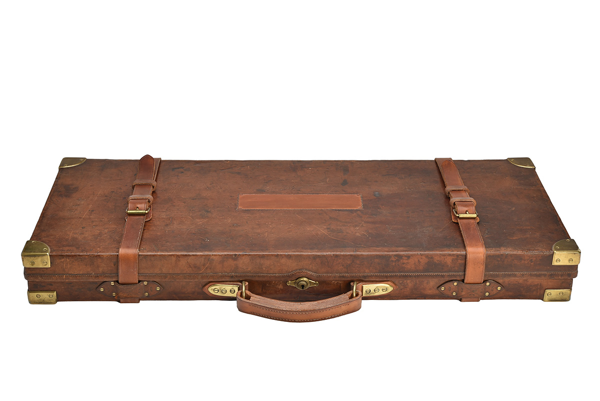 A BRASS-CORNERED OAK AND LEATHER DOUBLE GUNCASE,