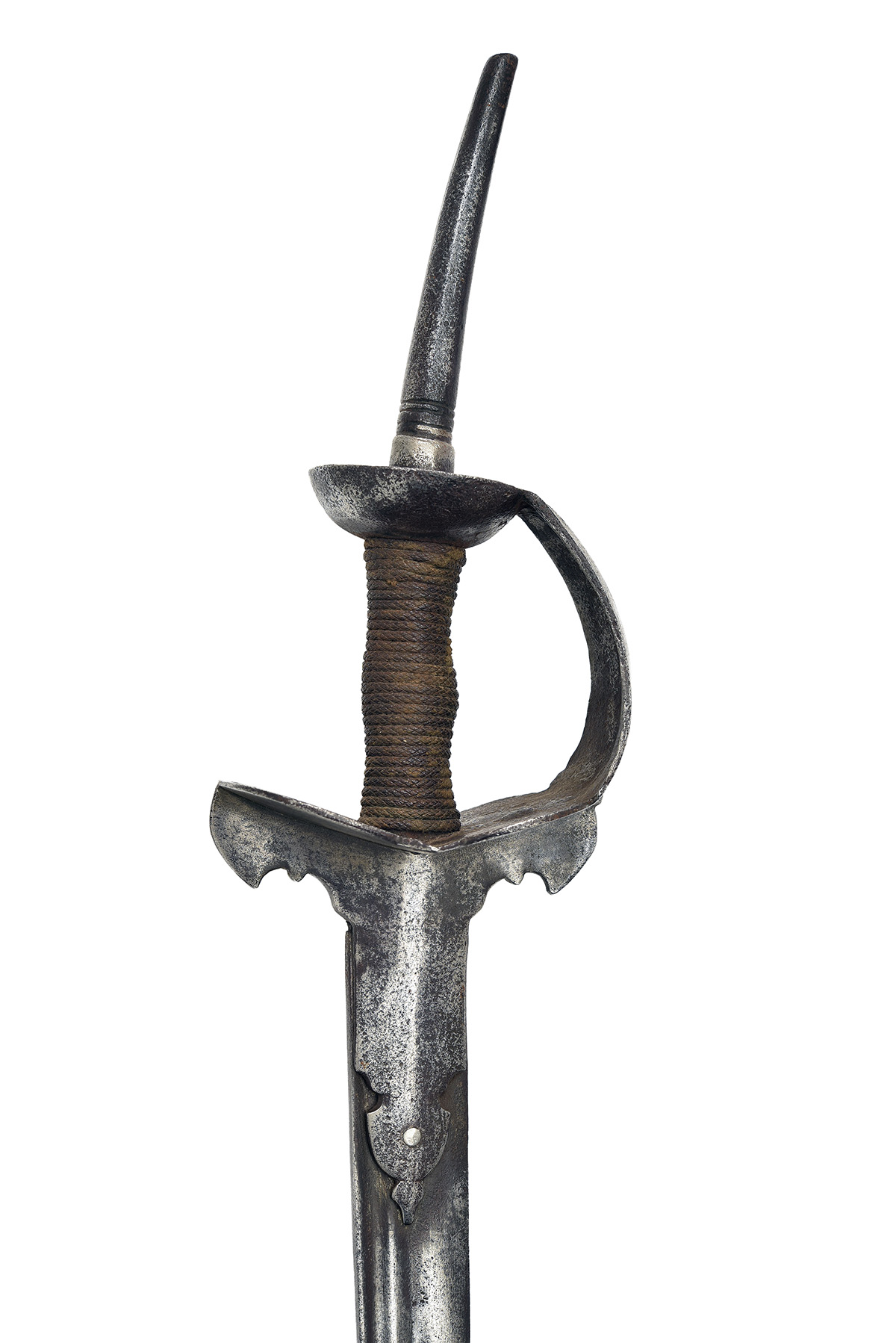 circa 1750, possibly Mahrattan, with European style straight 40in. single-edged blade with broad shallow central fuller extending nearly to the tip and narrower fuller along the back edge, traces of stamped symbols to the central fuller near hilt, iron guard with integral arabesque langets extending 4in. along the blade on each side and riveted to the blade at tip, broad knuckle-bow adjoining the reversed bowl pommel, a large slightly curved spike extending back from the centre, the whole worn and lightly cleaned, hilt re-bound