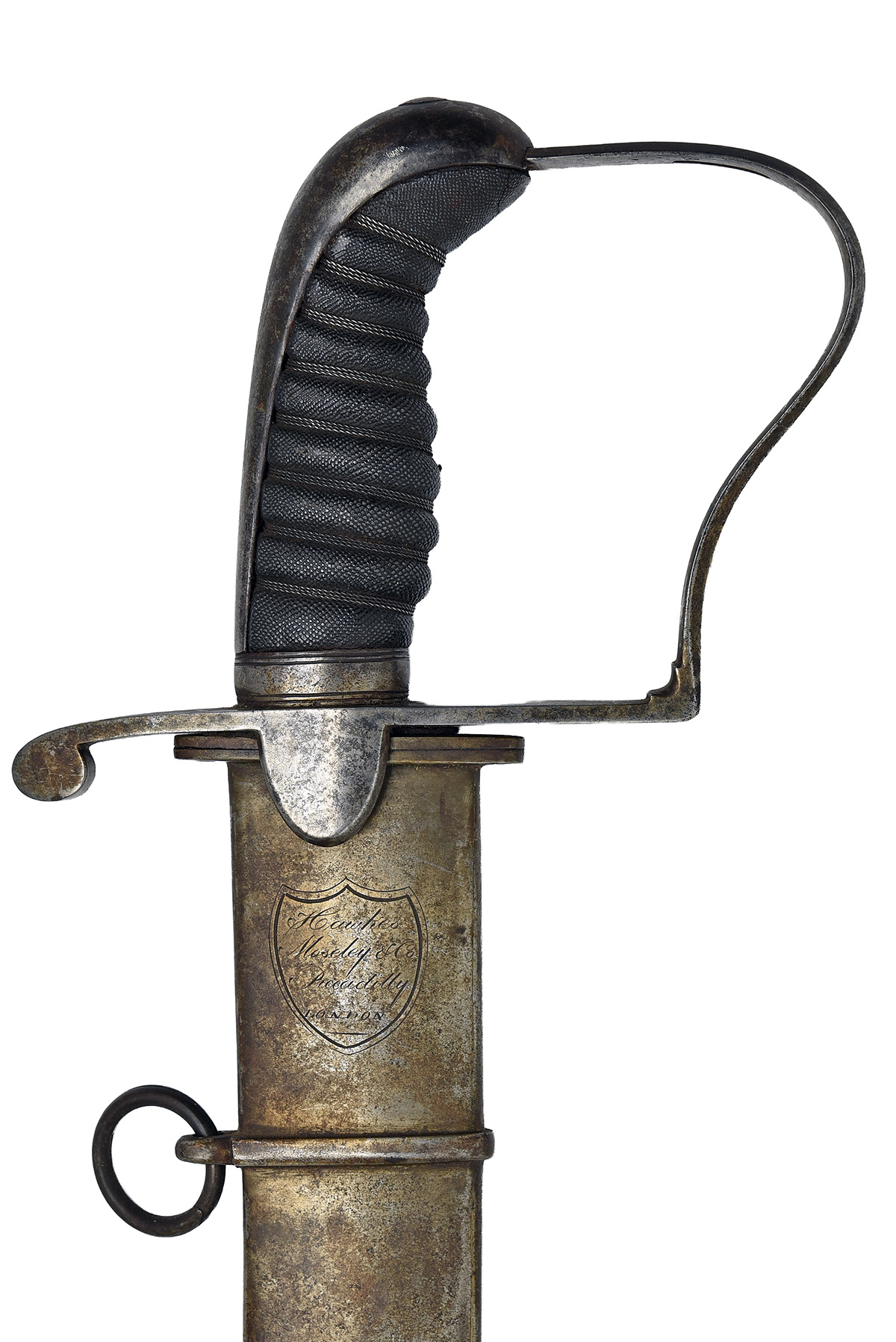 early 19th Century, with 29in. unmarked and unfullered curved single-edged blade, double-edged for the last 8in., 1796 cavalry sword hilt with wire-bound fish-skin grip, steel scabbard with engraved shield below the throat containing retailer's details 'Hawkes / Moseley & Co / Piccadilly / London' with two suspension loops