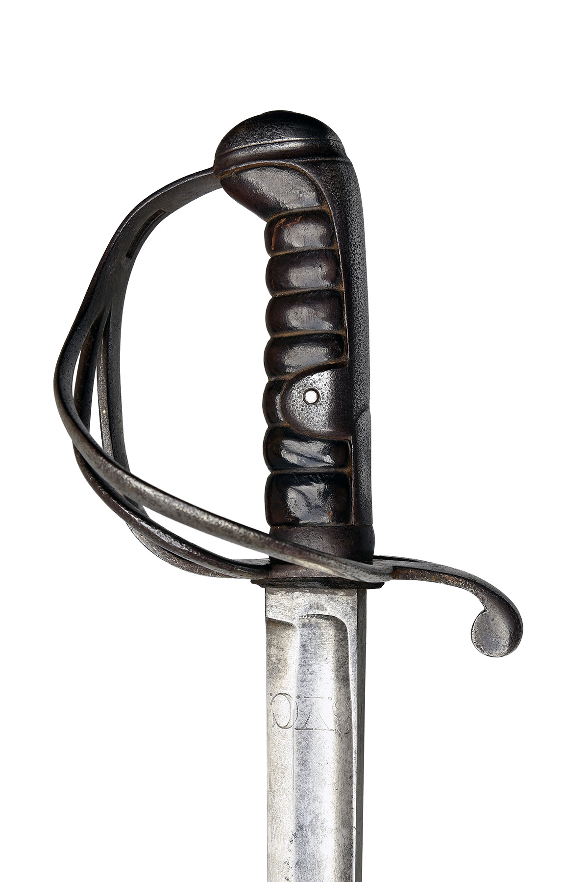 circa 1830s, with 35 1/4in. single-edged blade fullered on each side and engraved below the ricasso with 'S.Y.C.' (probably Sussex or Surrey Yeomanry Cavalry) to one side and '198' over, hilt with 3-barred guard, original leather wrap to the grip, steel scabbard with matching engraving to the sword and two suspension rings, blinded pitting to the hilt and scabbard