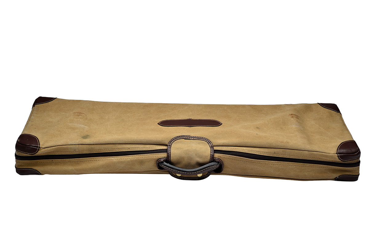 suitable for up to 33in. barrels, the interior lined with green baize, brass lock (including key), canvas and leather outer