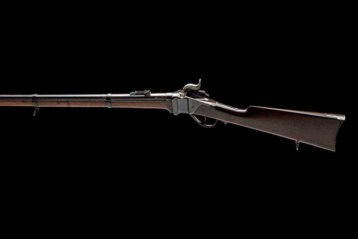 manufactured for use with the socket bayonet with blued 30in. barrel signed 'SHARPS RIFLE MANUF'G. CO. HARTFORD, CONN.', block and blade fore-sight, elevating ladder rear-sight, 'NEW MODEL 1859' stamped at breech, iron receiver with vertical breech-block, the lockplate with in-built pellet primer and marked 'R.S. LAWRENCE PAT. APRIL 12TH 1859', the body of the lock marked 'C. SHARPS PAT. OCT. 5TH 1852', left side of receiver marked 'SHARPS PAT. SEPT 12TH 1848', straight hand walnut butt-stock with traces of possible faint martial cartouches at head, iron patchbox, iron heel-plate, under-lever opening with sliding lock to tang, walnut full-length fore-end, three iron barrel-bands and nose-cap, strong amount of an older refinish