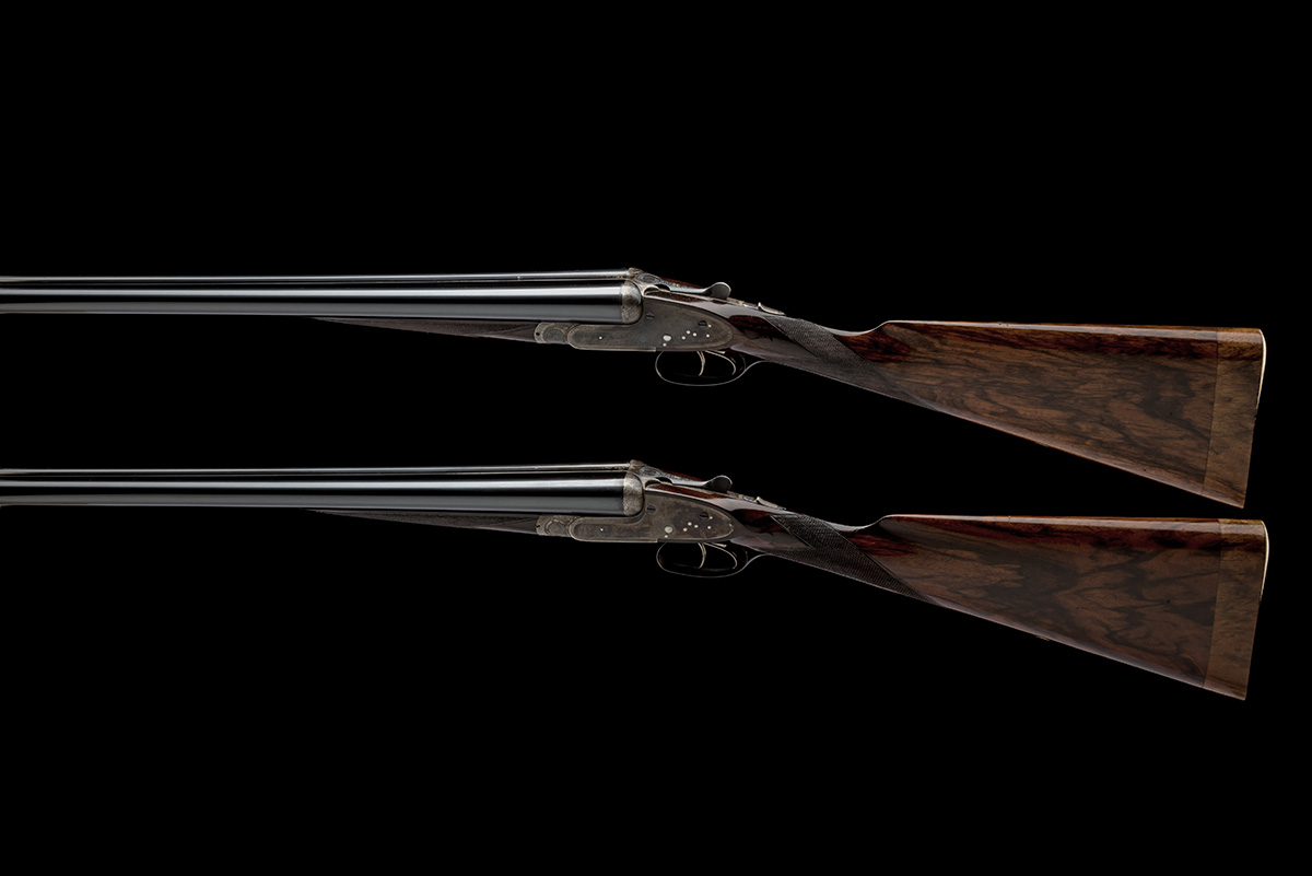 circa 1896, 29in. nitro reproved barrels (in 1963), the ribs engraved 'HENRY ATKIN (FROM PURDEY'S) 2 JERMYN STREET. HAYMARKET. LONDON' (very rubbed) and gold-inlaid '1' and '2' at the breech ends, 2 1/2in. chambers, bored approx. true cyl. in all, toplevers gold-inlaid '1' and '2', automatic safeties with gold-inlaid 'SAFE' details, best fine acanthus scroll engraving with beaded bordering, the lockplates with elaborate cartouches engraved 'HENRY ATKIN', the undersides with 'HENRY ATKIN FROM PURDEY'S', retaining much renewed colour-hardening and finish, No.2 ejectors at fault, 15 1/2in. figured stocks including 1 1/8in. wooden extensions, repairs and replacements to fore-end furniture, weight 6lb. 10oz. (No.1) and 6lb. 12oz. (No.2), in their brass-cornered oak and leather case
