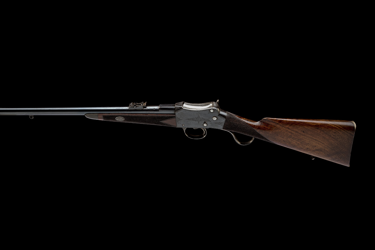 circa 1900, with blued tapering round 24in. barrel, block and blade fore-sight, small carbine style ladder rear-sight, the top of nocksform signed 'J.W. ROSIER, MELBOURNE', border and scroll engraved blued slab-sided action, polished feed-ramp, thumb safe and cocking indicator to right hand side, chequered walnut butt-stock and splinter fore-end, iron heel-plate, engraved trigger guard and under-lever, much original finish remaining