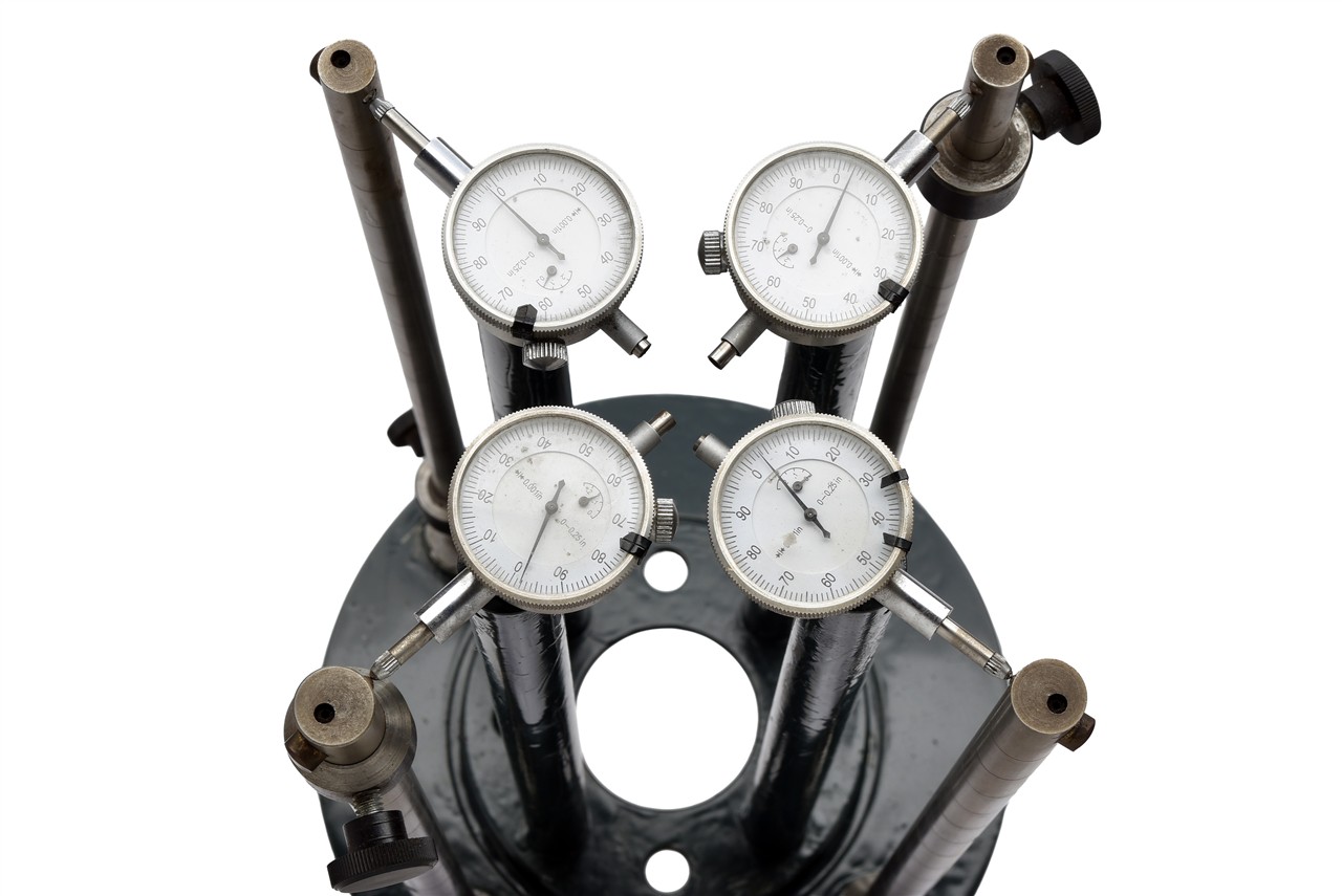 with green brake disc base, four upright prongs suitable for 12-bore, 16-bore, 20-bore and 28-bore, each with independent imperial gauge