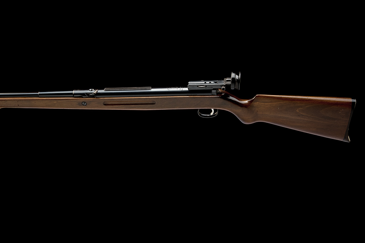 circa 1960, with blued 19 1/2in. barrel, ramp fore-sight with four post element on a rotating star and with tunnel protector, no provision for rear-sight, tap-action breech, plain air-chamber with applied dove-tail behind the loading tap and a further dove-tail to rear fitted with a factory mounted diopter peep-sight retaining its rubber eye-cup, beech three-quarter stock with unchequered half pistol-grip and finger-grooved fore-end, flush fitting under-lever with push-button release, generally collector's external condition