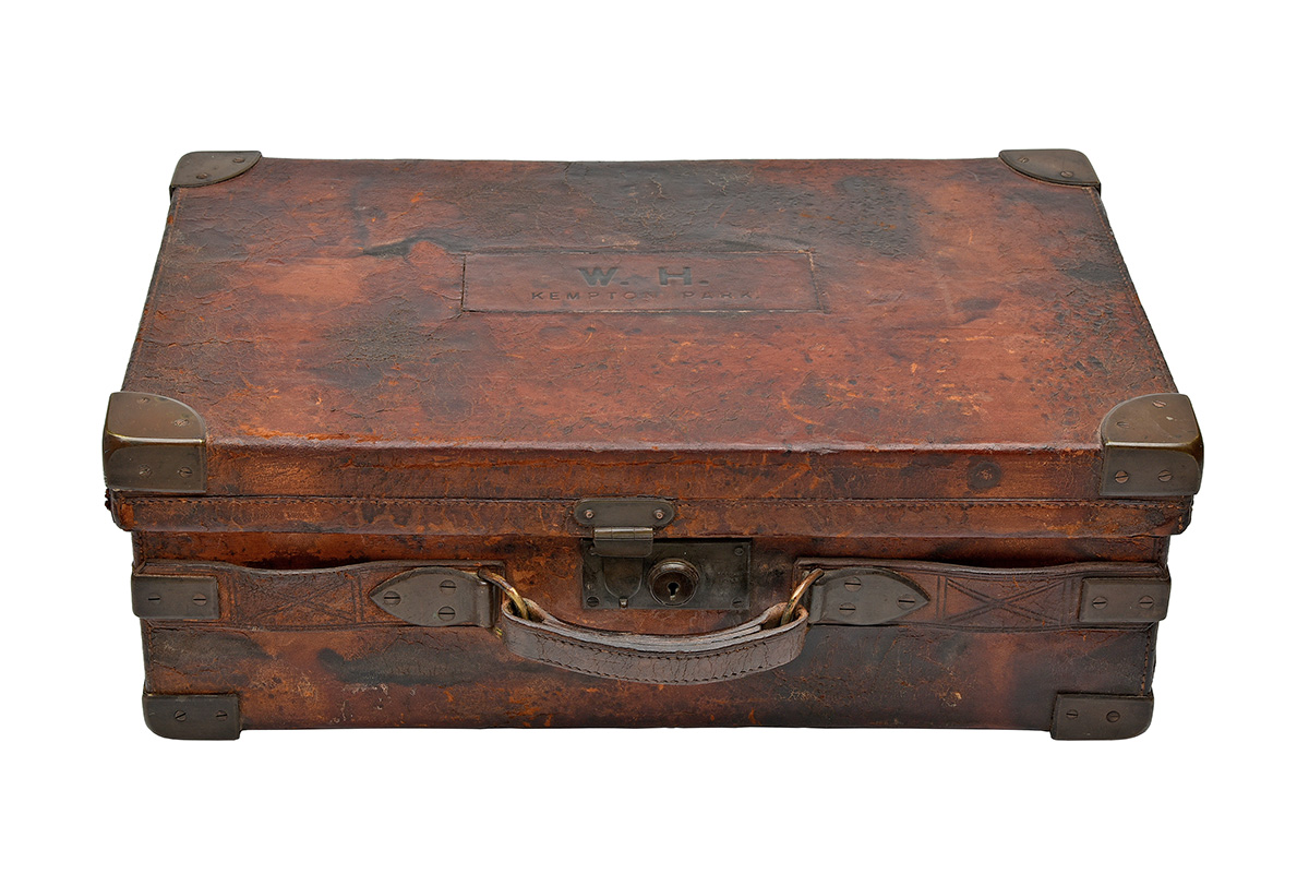 for approx. 450 cartridges, the interior lined with maroon baize, a leather gold-tooled William Evans trade label, five removable dividers, six leather lifters, brass lock including key, the lid exterior embossed with 'W.H. KEMPTON PARK', straps missing