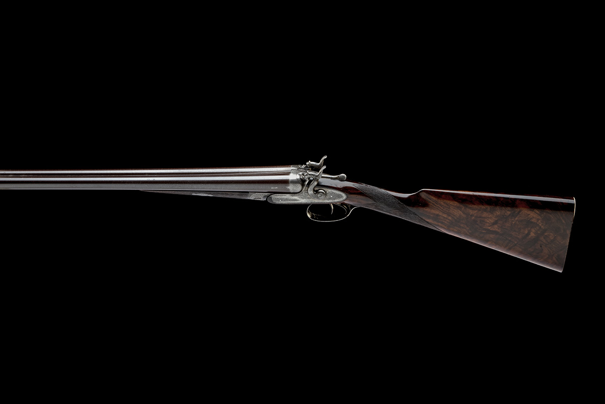 circa 1875, 26in. nitro reproved bold damascus barrels (shortened, possibly re-purposed), sunken rib engraved 'J. PURDEY 314 1/2 OXFORD STREET. LONDON.', 2 1/2in. chambers, bored true cyl. in both, left wall at 19+, carved percussion fences, toplever engraved 'PATENT', rebounding sidelocks with dolphin hammers, fine acanthus scroll engraving, the lockplates signed 'PURDEY', 14 1/4in. highly-figured stock (repaired cracks to underside to right side at knuckle), fore-end with crosspin release, weight 6lb. 5oz.