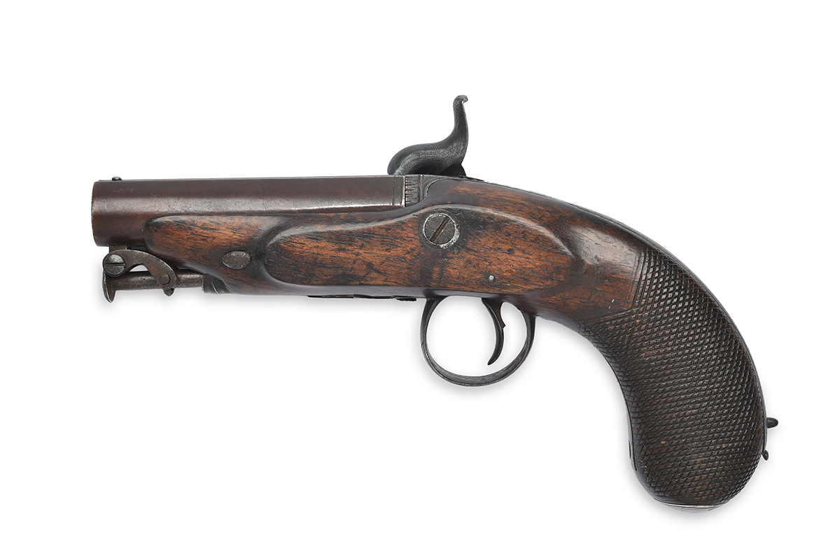 A 40-BORE PERCUSSION POCKET PISTOL WITH BACK-STRAP MAGAZINE, no visible serial number,