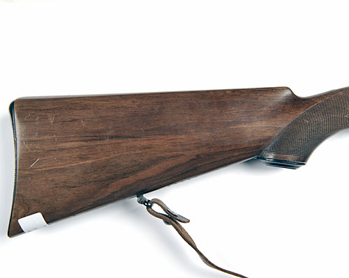 22 1/2in. blued nitro barrel with ramp-mounted bead fore-sight, rear-sight of one standing and one folding leaf, blued receiver, 14 1/2in. pistolgrip stock including steel buttplate with hinged butt-flap, leather sling.