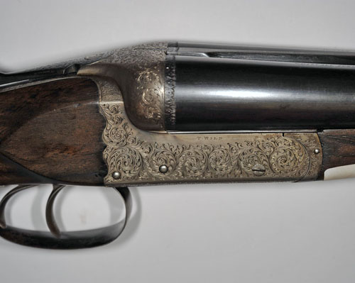 25in. nitro barrels with matt Churchill-rib, tubes engraved 'T. WILD. WHITTALL STREET. BIRMINGHAM.', 2 1/2in. chambers, bored approx. true cyl. and 3/4 choke, scroll-back treble-grip action, automatic safety with gold-inlaid 'SAFE' detail, bold acanthus scroll engraving, retaining traces of original colour-hardening and finish, 14 7/8in. figured stock including 1in. rubber recoil pad, weight 6lb. 7oz., in a canvas and leather case