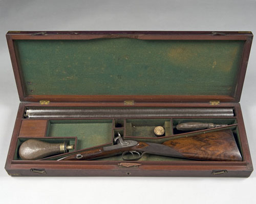 mid-19th century, with 30 1/4in. twist sighted barrels signed 'WOODWARD & CO. PATENT GUN MAKERS. DONCASTER' on the rib, serial numbered border engraved patent breeches each with two gold-inlaid lines and engraved with a sunburst on the rib between, scroll engraved grooved tang, border and scroll engraved locks each signed 'WOODWARD & CO.', figured walnut half-stock with chequered grip, engraved iron mounts including trigger-guard decorated with a scene involving a pointer flushing a partridge on the bow, silver escutcheon and barrel-bolt escutcheons, and original brass-mounted ramrod with worm, London proof marks, barrelsmith's mark 'CL' for Charles Lancaster, in brass-cornered mahogany case (locked, portion of front edge of lid broken off around the lock housing, detached portion present) lined with green baize with accessories including white metal mounted leather-covered Sykes powder-flask and Sykes leather shot-flask, the exterior with flush-fitting brass carrying handle and circular brass escutcheon.