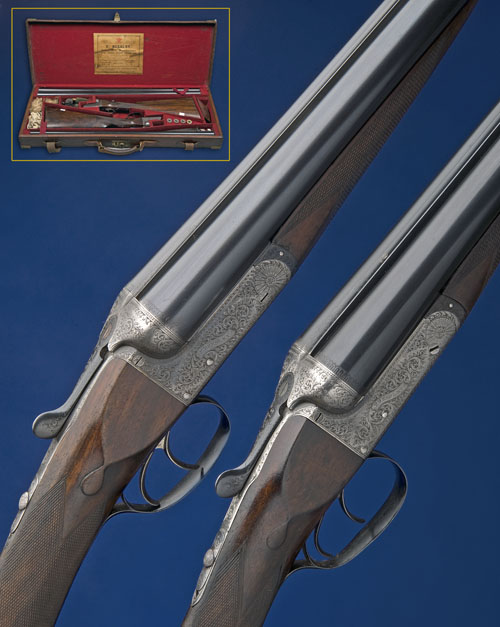 29in. nitro barrels, No.1 nitro reproved, and No.2 with replacement barrels, No.1 with rib engraved 'F. BEESLEY (FROM PURDEY'S. 2. ST. JAMES'S STREET. LONDON.', No.2 marked 'B. WILD' on the underside, 2 1/2in. chambers, bored approx. true cyl. and 1/4 choke (No.1) and imp. cyl. and 1/2 choke (No.2), automatic safeties, border and acanthus scroll engraving surrounding the makers name inscribed on a banner, retaining some original colour-hardening and finish, 15in. stocks, weight 6lb. 10oz. (No.1) 6lb. 14oz. (No.2), in their brass-cornered leather case (worn)