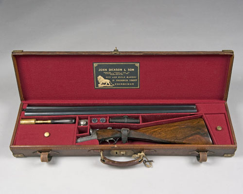 26in. sleeved nitro barrels, the rib engraved 'JOHN DICKSON & SON. 63. PRINCES STREET. EDINBURGH.' and inscribed '2', 2 1/2in. chambers, bored approx. 1/4 and 1/2 choke, Dickson patent round-action incorporating patents 9399 and 10621 of 1887, use number 511, automatic safety with gold-inlaid 'SAFE' detail, gold cocking indicators, profusely engraved with acanthus scrollwork surrounding a banner inscribed 'JOHN DICKSON & SON PATENT', brushed and blued finish, 14 3/4in. figured stock, weight 6lb. 5oz., in its brass-cornered leather case with some accessories