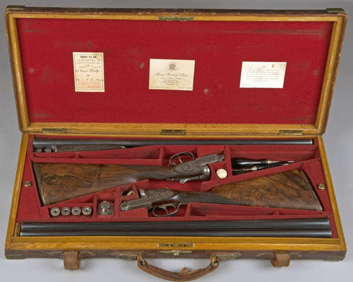 29in. Whitworth-steel nitro chopperlump barrels, ribs engraved 'J. PURDEY & SONS. AUDLEY HOUSE. SOUTH AUDLEY STREET. LONDON. MADE OF SIR JOSEPH WHITWORTH'S FLUID PRESSED STEEL.', some internal pitting, 2 1/2in. chambers, bored approx. 1/4 and 3/4 choke, automatic safeties, removable striker discs, cocking-indicators, best fine bouquet and scroll engraving, retaining some original colour-hardening and finish, 14 5/8in. highly-figured stocks including 5/8in. wooden extensions, weight 6lb. 11oz., in their brass-cornered oak and leather case with numerous accessories.