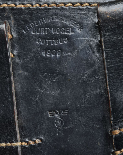 A RARE KREIGSMARINE ACCEPTED P08 LUGER HOLSTER BY LEDERWARENWERK CURT VOGEL, COTTBUS DATED 1938 with eagle swastika and M, holster in excellent condition