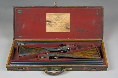 30in. 'Arcus steel' nitro barrels, the ribs engraved 'COGSWELL & HARRISON LTD. EXTRA QUALITY VICTOR EJECTOR 141 NEW BOND ST. LONDON' and gold-inlaid '1' and '2' at the breech ends, 2 1/2in. chambers, bored approx. imp. cyl. and 1/4 choke (No.1) true and imp. cyl. (No.2), automatic safeties with gold-inlaid 'SAFE' details, the toplevers gold-inlaid '1' and '2', inlaid cocking-indicators (one inlay missing), gold-washed single-triggers, gold-washed fore-end release catches, beaded border engraving, 14 1/4in. figured stocks (No.2 including 1/4in. wooden extension, weight 6lb. 8oz. (No.1) 6lb. 10oz. (No.2), in their brass-cornered oak and leather double guncase