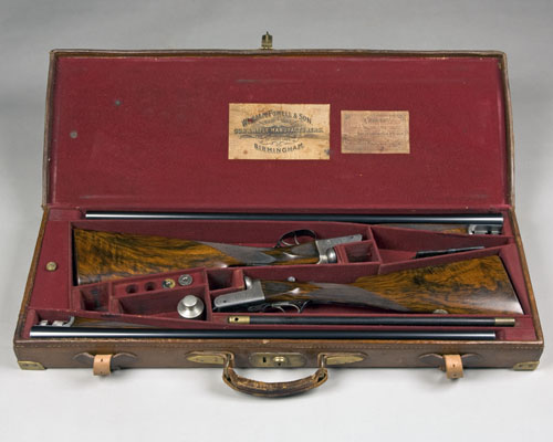 28in. nitro chopperlump barrels (No.2 nitro reproved), the ribs inscribed 'WILLIAM POWELL & SON. 35, CARR'S LANE. BIRMINGHAM.', scroll engraved and gold-inlaid '1' and '2' at the breech-ends, 2 1/2in. chambers, bored approx. imp. cyl. and 1/2 choke, treble-grip actions, automatic safeties with gold-inlaid 'SAFE' details, fine bouquet and scroll engraving, brushed bright and reblued finish, 14 1/2in. figured stocks with chequered side panels (pinned at head), weight 6lb. 4oz. (No.1) 6lb. 3oz. (No.2), in their makers brass-cornered leather case