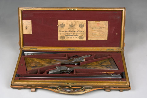 28in. barrels; No.1 nitro reproved, 2 1/2in. chambers, bored approx. imp. cyl. and 1/2 choke, No. 2 replacements by the makers in 1981, 2 3/4in. chambers, bored approx. imp. cyl. and 1/2 choke, the tubes inscribed 'STEPHEN GRANT & SONS. 7, BURY STREET, ST JAMES'S, LONDON, ENGLAND', the ribs scroll engraved at the breech ends and gold-inlaid '1' and '2', fluted fences, automatic safeties with gold-inlaid 'SAFE' details, the toplevers gold-inlaid '1' and '2', removable striker discs, left-handed triggers, best fine acanthus scroll engraving, retaining much original colour-hardening and finish, 15in. figured stocks including 1 1/2in. wooden extensions, cast on for a left-hander, cheekpieces removed and with well executed wooden inserts, weight 6lb. 13oz. (No.1) 7lb. 1oz. (No.2), in their makers brass-cornered oak and leather double guncase with canvas outer. We are kindly informed by the makers that this pair of shotguns were completed May 1908 for Captain S.F. Saunderson.