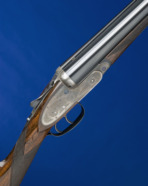 28in. nitro chopperlump barrels, rib gold-inlaid '2' and engraved 'J. PURDEY & SONS. AUDLEY HOUSE. SOUTH AUDLEY STREET. LONDON. ENGLAND.', 2 1/2in. chambers, bored approx. 1/4 and 1/2 choke, self-opening action with removable striker discs, automatic safety with gold-inlaid 'SAFE' detail, cocking-indicators, best bouquet and scroll engraving, retaining some original colour-hardening, 14 1/2in. well-figured stock including 3/4in. leather covered recoil pad, weight 6lb. 9oz. We are kindly informed by the makers that this shotgun was completed December 1974.