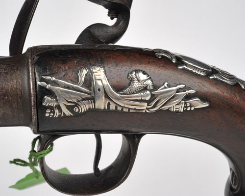 circa 1740, with 5 1/4in round smooth-bore barrel, breech-block signed 'WILSON', together with London proofs and the makers mark 'RW', long external stepped frizzen-spring, walnut swollen bag-shaped stock, separate tang, silver martial side plate, fancy martial trophy escutcheon and grotesque mask butt cap, trigger-guard safety (some discolouration and bruising to metal-work, safety at fault).