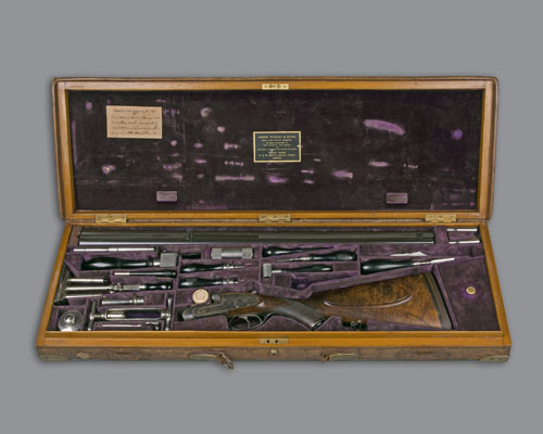 27in. black powder only Whitworth-steel chopperlump barrels with raised partially filed rib, engraved 'MADE FOR R.B. RODDA & CO. GUN & RIFLE MANUFACTURERS, CALCUTTA.', tubes engraved 'J. PURDEY & SONS, AUDLEY HOUSE, SOUTH AUDLEY STREET, LONDON. SIR JOSEPH WHITWORTH'S FLUID PRESSED STEEL.', ivory-inlaid open sights with folding leaf sight (with silver inlay) for 200 yards, bead foresight with flip-up moonsight, Purdey patent self-opening action with hidden third bite, side-clips, removable striker discs, bolted automatic safety with gold-inlaid 'SAFE' and 'BOLTED' details, arrow cocking-indicators, best fine bouquet and scroll engraving, retaining much original colour-hardening and finish, 14in. highly-figured pistolgrip stock with cheekpiece, finely engraved steel pistolgrip-cap, sling swivels and 3/4in. rubber recoil pad, weight 7lb. 15oz., in its fine brass-cornered oak and crocodile skin case (missing handle) with purple velvet lining, complete with a virtually full complement of tools and accessories (some serial numbered), including a crocodile skin cleaning kit pouch, the lid with charge specifications listing 'Powder - 80 grains Curtis & Harveys No.6; Wadding - thin card & greased cloth; Bullet - 230 grain papered express bullet; Cartridge Case - 450-400 solid drawn 2 3/8 inches'. We are kindly informed by the makers that this rifle was completed December 1893 and supplied to Messrs. Brooks Brothers.