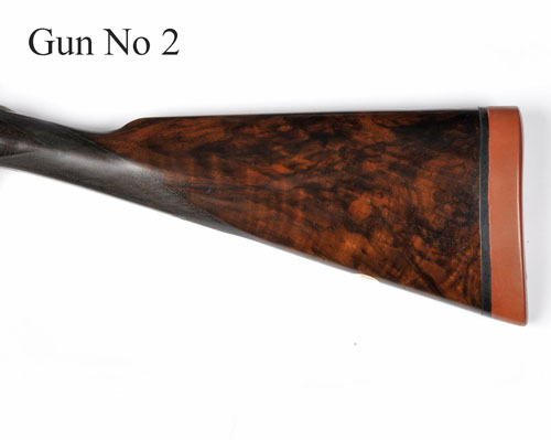 27 5/8in. nitro chopperlump barrels (No.2 reproved in 2010) with raised ribs (No.2 matt), 2 3/4in. chambers, bored approx. 1/4 and 3/4 choke, treble-grip actions, toplevers gold-inlaid '1' and '2', patent gas checks, removable striker discs, automatic safeties, articulated front triggers, profuse engraving of floral and acanthus scroll motifs, the undersides with vignettes of alighting mallard in wetland settings, silver finish overall, 15in. highly-figured stocks including 1in. rubber recoil pads, fore-end woods with light damage to edges and insert repair to No.1, weight 7lb. 1oz.