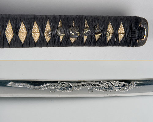 with 27in unsigned blade possibly 17th century, re-mounted in the late 'Edo' period, clearly visible 'chu-suguha' style hamon (one small edge-nick), later horimono, possibly to disguise pitting, ovate iron tsuba with geometric border decoration, cotton tsuka-ito with bronze dragon menuki, black lacquered saya with minute gold flecking and an iron kojiri (good polish to blade with small areas of old pitting, light scratching to saya)