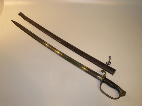 * A FRENCH MODEL 1845 INFANTRY OFFICER'S SWORD dated 1901, with 30 1/4in quill-point blade signed on the back edge by the Chatelleraut Arsenal, brass hilt pierced with floral motifs and carved leaf decoration, wooden grip with spiral wire binding, TOGETHER WITH its original plain steel scabbard (minor losses to finish throughout, edge nicks to blade, scabbard discoloured and dented)