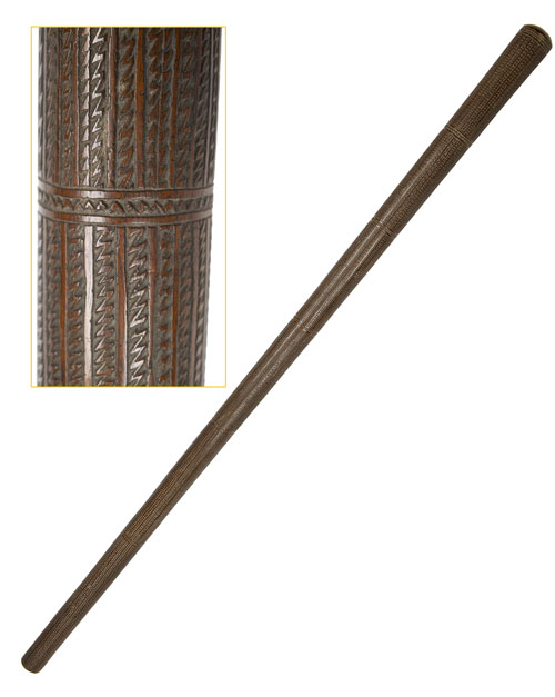 circa 1800, carved from a single piece of lignum vitae, the 42 1/2in. tapering shaft fully carved with six graduated segments of length-ways saw-tooth geometric patterns bordered with a single horizontal zig-zag band, flattened base to the grip end (minor losses to edges) and terminating in a dome