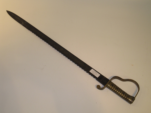 AN 1856 PATTERN BRITISH PIONEERS 'SAW-BACK' SWORD, circa 1860, with 25 1/2in spearpoint saw-backed blade (discoloured), brass hilted with stepped stirrup guard and turned down quillion.