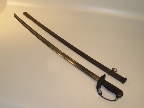 A JAPANESE 'KYU-GUNTO' MOUNTED INFANTRY SWORD, early 20th century, with slightly curved 32 3/4in arsenal produced fullered blade of Japanese style numbered '83394' at the forte (patches of discolouration and mild pitting), steel rolled-edge stirrup guard with leather finger-loop and scabbard release catch, heavy, coarsely chequered steel back-strap with similarly chequered wooden fore-grip (light surface corrosion, TOGETHER WITH its original steel scabbard (corroded)