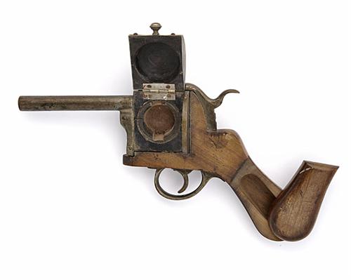 A NOVELTY VICTORIAN INKWELL AND NIB HOLDER IN THE SHAPE OF A PINFIRE REVOLVER