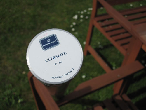 A LARGE FISHING GAFF, with four foot wooden handle and leather strap