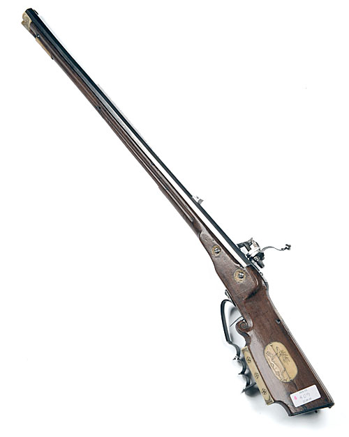 early 18th century, with unsigned 31in octagonal, swamped, sighted barrel, dovetailed brass bead foresight, later folding twin-leaf rearsight (dovetailed brazed inserts present from earlier sighting system), fancy sideplated internal wheel-lock semi-waterproof mechanism engraved with a stag within a field of feathered scrolls, fancy carved hammer with extended cocking-piece, external cock-spring, automatic pan cover, classic, triangular section fruitwood full-stock with engraved and stained small bone inlays to the comb and cheek-piece, sliding wood-covered bone-inlaid patchbox to the right hand side, horn heel-plate with trefoil bordering (steel shoulder button broken off and missing), sheet-iron finger-grooved trigger guard with 'antler'-shaped rear tang, 'hogs-bristle' trigger with rear set, bone, engraved and stained side nail escutcheons, ramrod throat and forend tip, provision for swivels (missing, rear location filled) and bone-mounted, possibly original ramrod (iron surfaces polished and brushed bright, small losses to edges of forend and ramrod channel