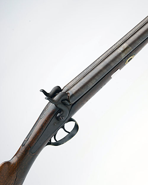 * A 16-BORE PERCUSSION DOUBLE-BARRELLED SPORTING GUN, UNSIGNED, Belgian, circa 1870, with 31in. barrels (muzzles worn), back-action locks and a walnut half stock, the rear of grip carved in the form of a stag, original ramrod (iron surfaces discoloured, thimbles crudely re-attached, crack to fore-end and slight worm)