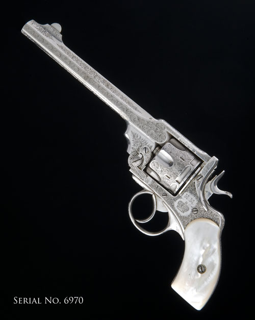 AN EXCEPTIONALLY FINE AND RARE CASED PAIR OF .38(S&W) LONG-BARRELLED SIX-SHOT DOUBLE-ACTION PRESENTATION NICKEL-PLATED REVOLVERS, MODEL MKIII POCKET, serial no's 6970 & 6971,