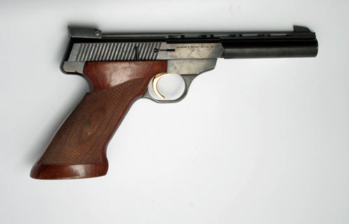 ** A .22 (LR) SEMI-AUTOMATIC TARGET PISTOL SIGNED FN, MODEL 'BROWNING 150', serial no. 71491T75, with 6in. bull-barrel with raised, matted sighting rib and adjustable sights, blued frame and anatomical right-hand walnut grip