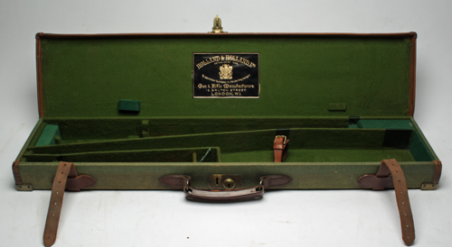 A BRASS-CORNERED GREEN CANVAS & LEATHER TAKE DOWN RIFLE CASE, lined with green baize, brass lock (including key), with modifications to boxing, a Holland & Holland trade label on the interior lid, straps & handle in good order