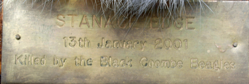 A HEAD & CAPE MOUNT OF A HARE, mounted on a wooden shield, with 'STRANGE EDGE' 13th January 2001 killed by the Black Coombe Beagles engraved on a brass plaque