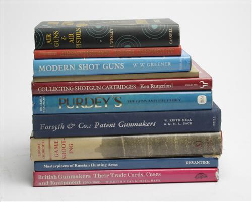A QUANTITY OF SPORTING BOOKS, ALL EX LIBRIS GEOFFREY BOOTHROYD, the titles being; The British Shotgun Volumes 1 & 2 by Crudgington & Baker, The Handgun by Boothroyd, Game Shooting by Robert Churchill (first edition), Masterpieces of Russian Hunting Arms by Dr. Jurij Miller, Griffin of Bond Street by Eric Griffin, The Scottish Pistol by Martin Kelvin, Cogswell & Harrison by Cooley and Newton, British Gunmakers Their Trade Cards, Cases and Equipment by Keith Neal and Back, Forsyth & Co. by Keith Neal and Back, Purdey's The Guns and the Family by Richard Beaumont (first Edition), Collecting Shotgun Cartridges by Ken Rutterford, Modern Shotguns by W.W. Greener, Air Guns and Air Pistols by L. Wesley, The Rev. Alexander John Forsyth and His Invention of the Percussion Lock by Maj-Gen. Sir Alexander John Forsyth Reid, Automatic Pistol Marksmanship by William Reichenbach, all titles in good order and several containing inscriptions by Boothroyd. (16)