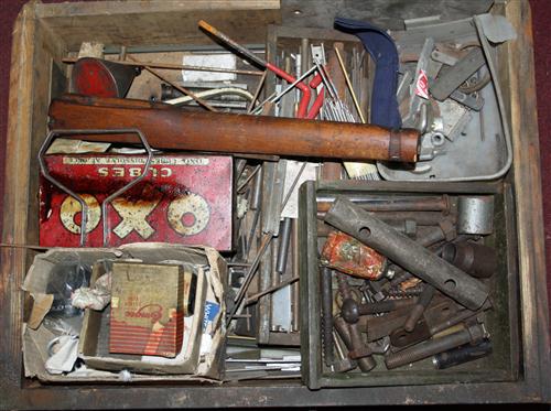 FOUR WOODEN DRAW OF GUN RELATED TOOLS, including brazing rods, nuts bolts etc, together with a plastic tub of similar items