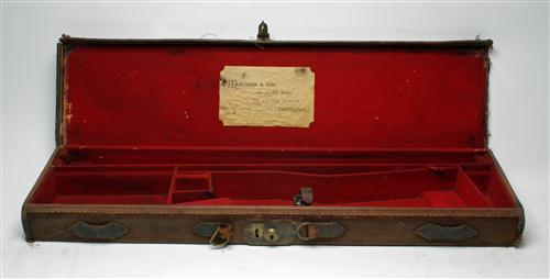 A CANVAS & LEATHER SINGLE GUNCASE, fitted for 30in. barrels, lined with red baize, brass lock (key missing), interior lid supporting a Mortimer & Son trade label, straps & handle missing