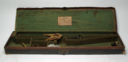 A CANVAS & LEATHER GUNCASE, fitted for 30in. barrels, lined with green baize, brass lock (key missing), with an Adams & Co trade label on the interior lid