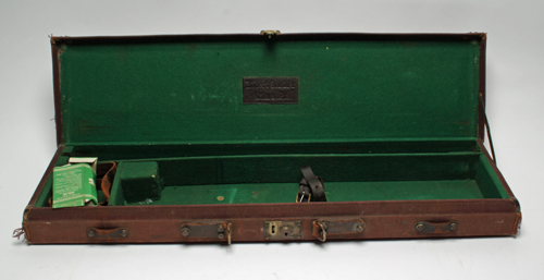 A CANVAS & LEATHER SINGLE GUNCASE, fitted for 30in. barrels, lined with green baize, brass lock (key missing), the interior lid with a Robert Schuler trade label, handle & straps missing