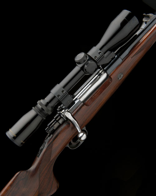 24in. nitro barrel with open sights and ramp-mounted blade foresight, the receiver mounted with a Burris Signature 3x-9x telescopic sight, manual tang safety, recoil block, hinged floorplate with military style release catch, well-figured pistolgrip stock with cheekpiece, dark wood fore-end finial,14 3/4in. pull including 7/8in. rubber recoil pad