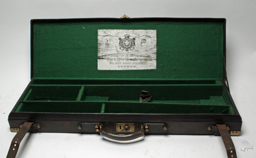 A BRASS-CORNERED LEATHER TAKE DOWN RIFLE CASE, fitted for 27 1/2in. barrels, lined with green baize, brass lock (key missing), the interior lid supporting a copy Holland & Holland trade label, straps & handle in good order, the exterior lid with a brass plaque engraved P.D. NEWBOULT