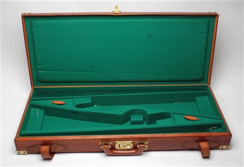 A BRASS-CORNERED PIGSKIN LEATHER DOUBLE GUNCASE