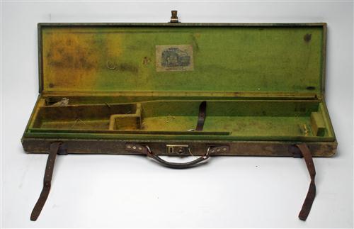 A MONK CANVAS & LEATHER SINGLE GUNCASE, fitted for 28in. barrels, loned with green baize, brass lock (key missing), the interior lid with a 'MONK' trade label,