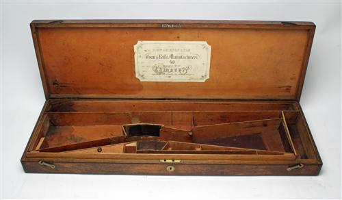 fitted for 30in. barrels, lined in Moroccan leather, two brass clips, the interior lid with a 'JOHN DICKSON & SON' trade label, the exterior lid with a centre brass escutcheon surrounded by a flush fitting carry handle.
